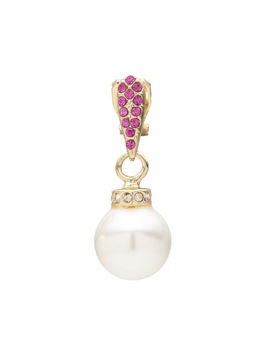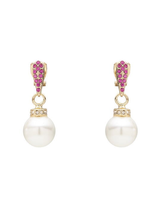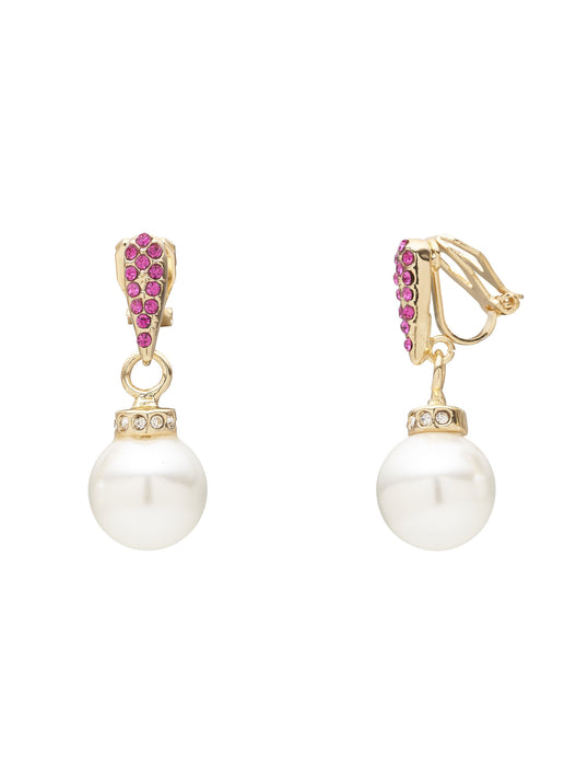 Elevate your style with these exquisite Crystal Pearl Clip On Earrings. These beautiful clip drop earrings capture timeless style with a modern pop of colour, featuring gold-coloured plating, fine sparkling pink stone detailing, and lustrous faux pearl drops.