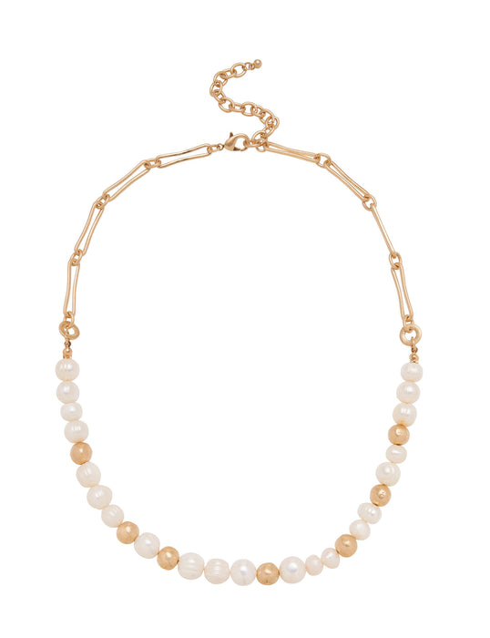 Add a touch of glamour and sophistication to your look with our Pearl Statement Necklace. With sleek gold-coloured plating, glossy faux pearls and bright gold-coloured feature beading, this necklace is a stunning piece to compete your favourite looks. Pair it with day wear to elevate your everyday style, or with chic dresses and evening wear for a polished, elegant finish.