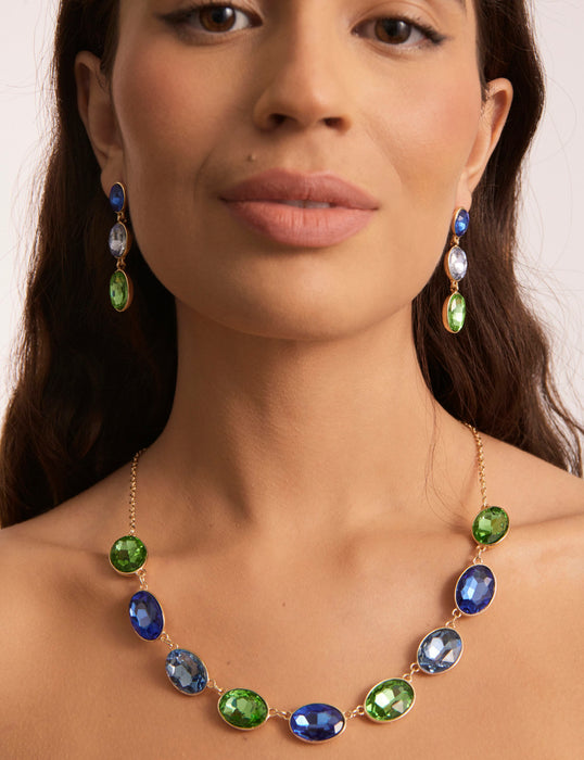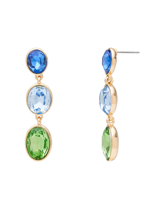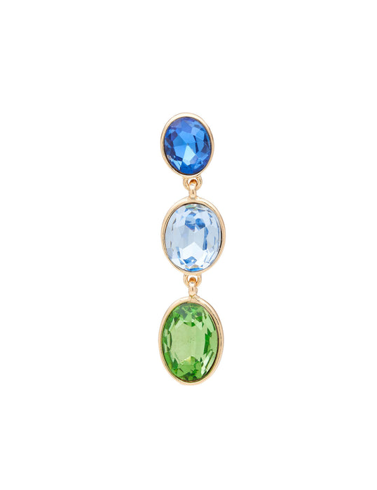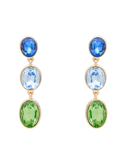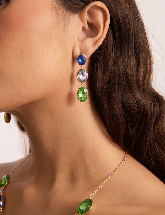 Introducing our beautiful Perigian range, featuring gorgeous blue and green crystals. The eye-catching Perigian Stone Mix Drop Earrings captures vibrant colour to elevate any outfit, with gold-coloured plating and faceted oval stones in bright blues and green. To complete your look, pair it with the Perigian Stone Mix Necklace, available separately.