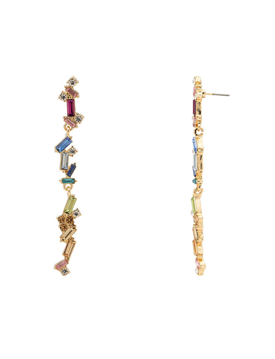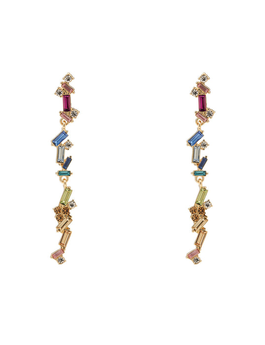Not your classic crystals! These pretty drop earrings will turn heads with colourful sparkling stones for a fresh and fun feel to finish any look. The Rainbow Party Drop Earrings feature a cascade of multi-coloured stones with fine sparkling details, pairing beautifully with party dresses and evening looks, and with causal looks with statement colour and style.